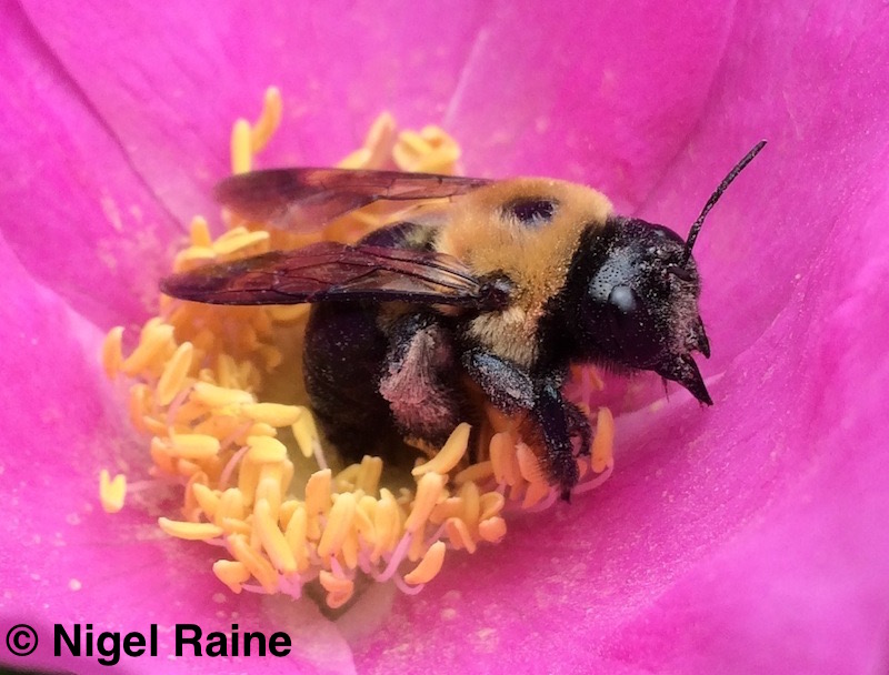 Raine and his team has made major advancements in our understanding of how essential pollinators are affected by environmental stress, including toxic impacts of pesticides and their interactions with parasites. This research on the impacts of environmental stressors, emerged from his extensive studies of individual and colony level variation in bee behaviour. Raine’s work has been at the forefront of the recent surge of research interest in pesticide impacts on bees, and particularly highlights the importance of sublethal impacts on the behaviour of individual bees and how these can have significant knock-on effects on both colony function and population traits. Indeed, Raine and his team were the first in the world to conduct experiments to measure the sublethal effects of combined exposure to multiple insecticides at field-realistic levels on bee behaviour and colony function (Gill, Ramos-Rodriguez & Raine. 2012. Nature 491: 105-8). Results of this work have received considerable attention from regulators and policy makers around the world, and over 350 citations from the scientific community to date. Raine and his team were also the first in the world to demonstrate that exposure to field-realistic levels of neonicotinoid insecticides can lead to measurable reductions in the pollination services provided by bees to economically important crops. Changes measured in learning and foraging behaviour lead to both reduced collection of pollen from apple flowers and also less effective transfer of pollen between varieties. These results are the first to show economic impacts for farmers of unintended consequences of insecticide exposure on pollinators (Stanley et al. 2015. Nature 528: 548-50).